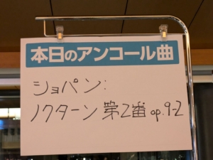アンコールは、ショパンの有名なノクターン第2番。ローム株式会社創業者の佐藤氏はショパンをこよなく愛しておられていた、ということでの選曲だったのかもしれません。