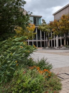 ホール前は、かなりの強風が吹いていて、花壇の草花が右に大きく傾いていました。