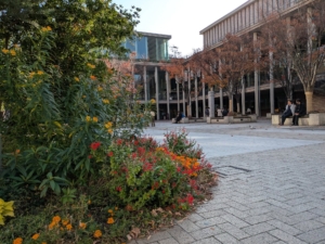 ホール前の花壇の、その奥で綺麗に紅葉していた木々は、随分と葉っぱを落としていました。
