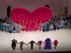 演出は、とりたてて特殊なものではありませんでした。舞台装置としては、大きなハートのオブジェがメインで、あとは椅子が並べられたり、ベルコーレとアディーナの婚約披露宴でテーブルが並べたりといったくらいで、とても簡素なものでもあった。そのようなために、音楽を邪魔することが全くと言って良いほどになかったのが、私には有難かった。